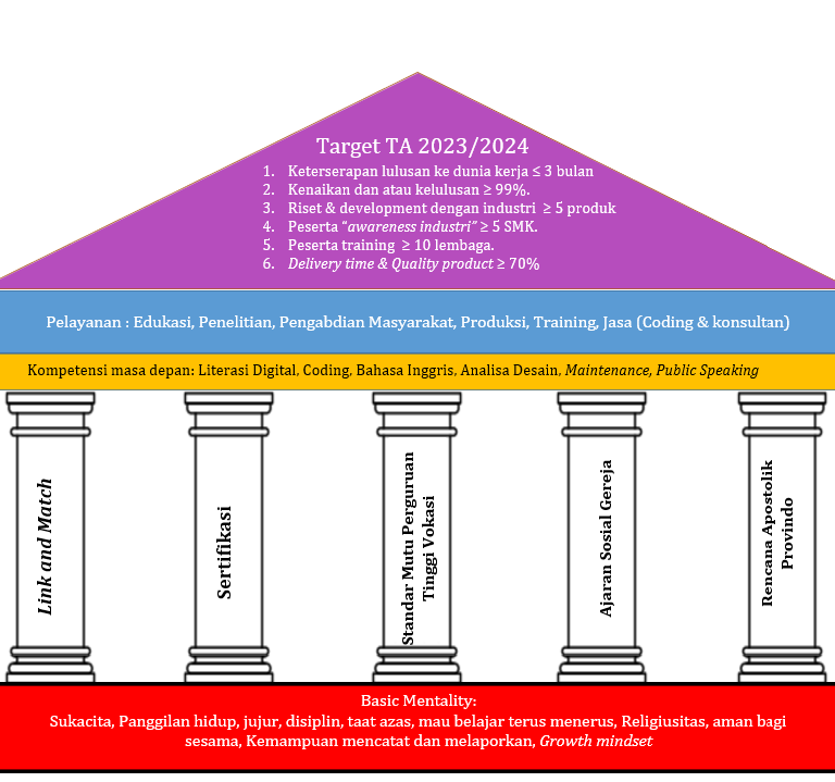 Mendidik kaum muda menjadi tenaga profesional yang memiliki kemampuan teknis dan tanggung jawab moral yang dirumuskan dalam 4C+1L: Competence, Concience, Compassion, Commitment + Leadership
